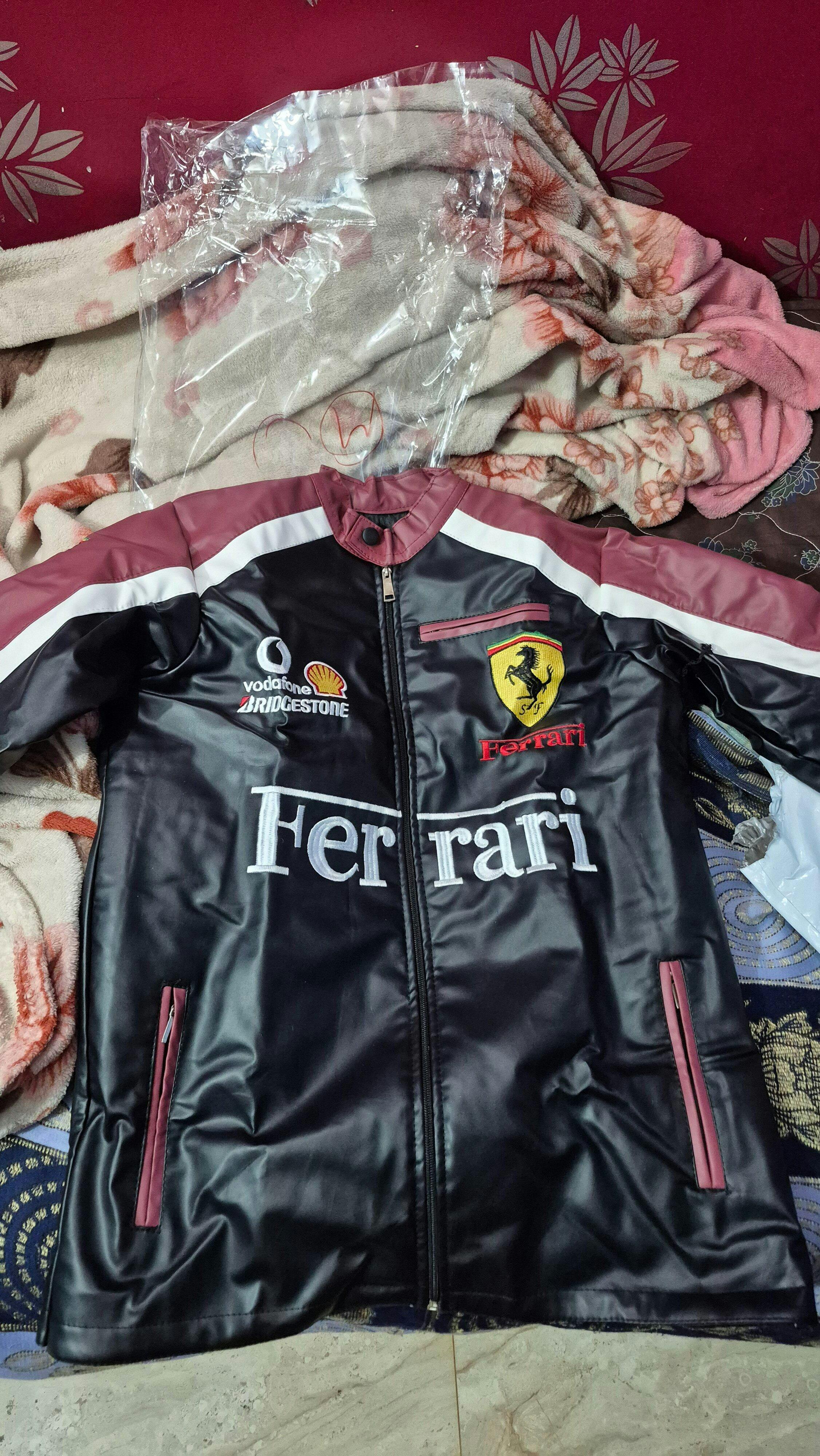 The jacket features premium embroidery of Ferrari logos, racing sponsors, and motorsport detailing, giving it an authentic race-ready look. With its striking black base and red-white racing stripes, this jacket is designed for those who love fast cars, bold fashion, and statement outerwear.